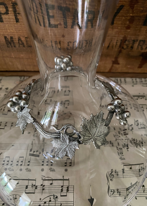 Glass and pewter wine decanter. Holds 750l. Height approx 21cm. Diameter base 18.5cm. Well weighted with punt for easy pouring. ...