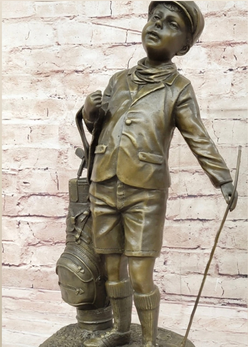 Large bronze on marble base of boy golfer. Dimensions H18", W8.75". Marble base diameter 8.75". Made in Spain