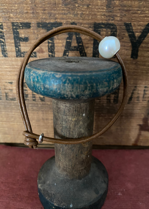 Leather bracelet with white fresh water pearl. Findings are all sterling silver. Small sterling silver ring acts as sliding clasp. ...