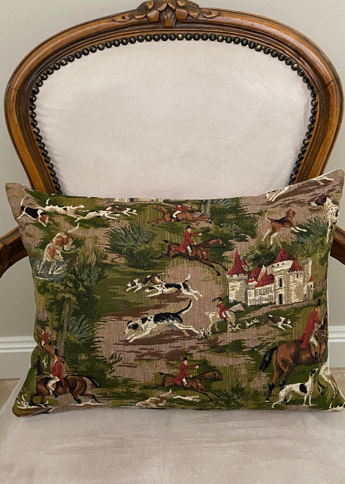 Horses and hounds hunting theme woven tapestry cushion. Approx 33cm x 46cm. Front panel loomed in Europe. Light beige British...