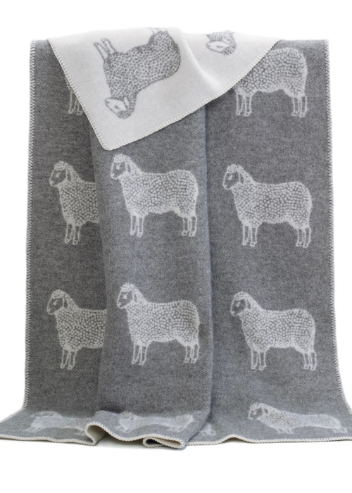 80% wool, 20% cotton throw. Soft grey and off white sheep design. The throw has an inverted colour scheme on...