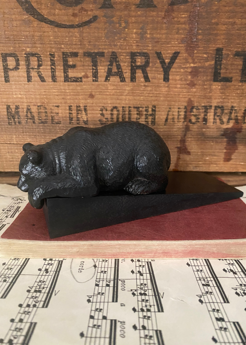 Bear door wedge/stop. Wooden wedge with resin bear screwed into base. Approx dimensions 16.5cm length, 6.5cm height, 5.5cm width