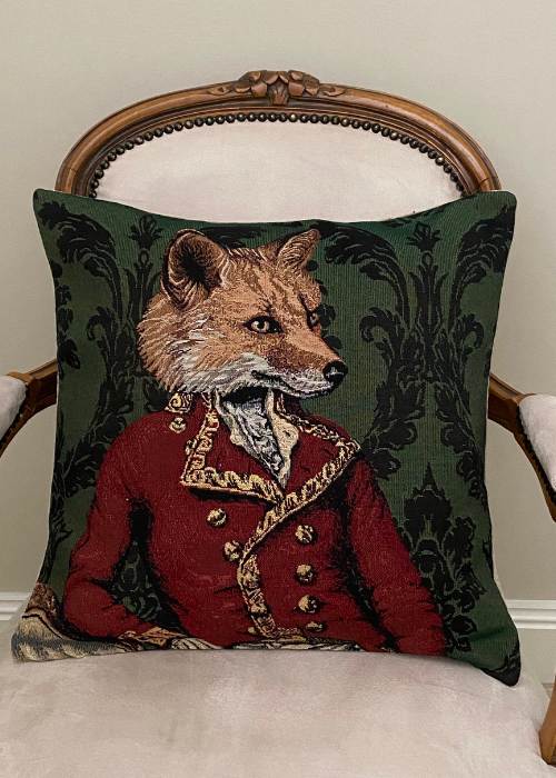 Fox design woven tapestry cushion. Approx 46cm x 46cm. Front panel loomed in Europe. Light beige British velvet back.