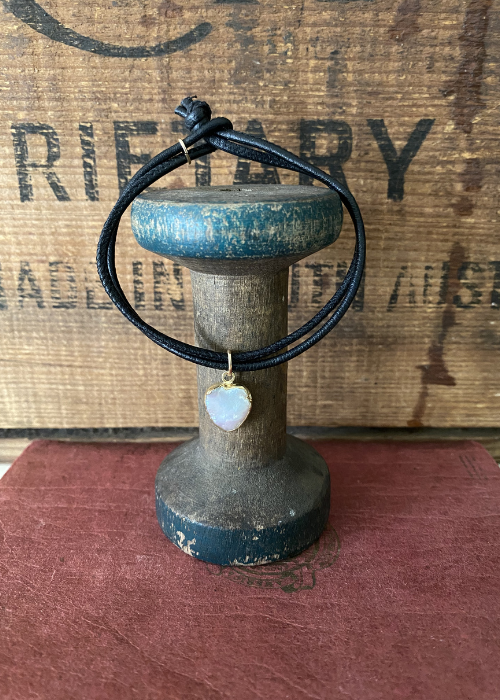Leather bracelet with mother of pearl dangle. All findings gold filled. Approx length 19.5cm. Sliding gold filled ring to close...